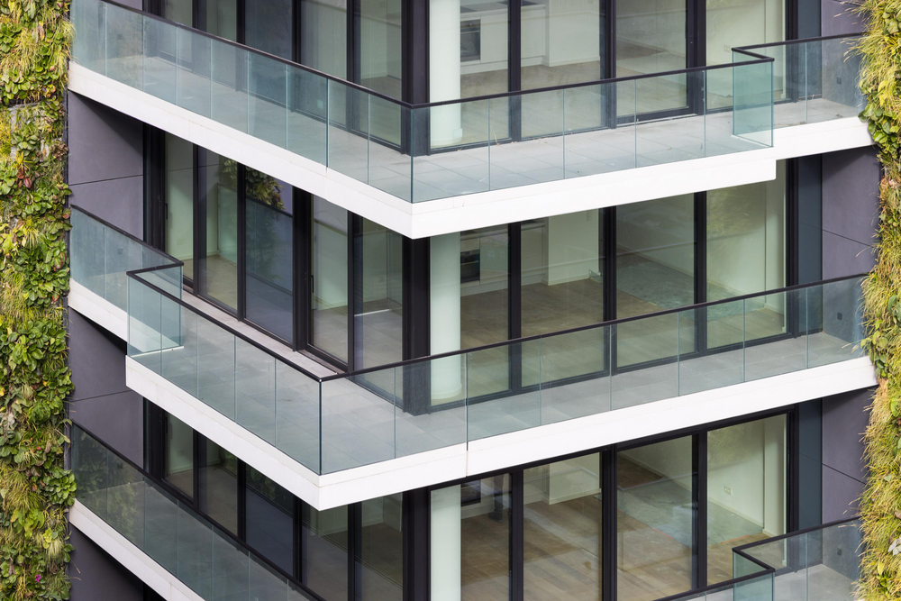 Das Erscheinungsbild des Hochhauses wird durch das Zusammenspiel von vertikalem Grün und horizontalen Glasbändern mit unterschiedlich weit auskragenden Bodenplatten geprägt. Dieser gestalterische Anspruch setzt sich bis zu den Balkonen fort, die den Innenraum nach außen erweitern und Rückzugsorte inmitten der großmaßstäblichen Umgebung von Mainhattan bieten. Hier tragen hochwertige Balkontrennwände, verkleidet mit nachhaltigen Faserzementtafeln von EQUITONE [tectiva] im Farbton TE85 Graphit, zum rundum edlen Wohnkonzept bei. Die natürliche und elegant anmutende Material- und Farbwahl ergänzt dabei harmonisch die Grünfassade.