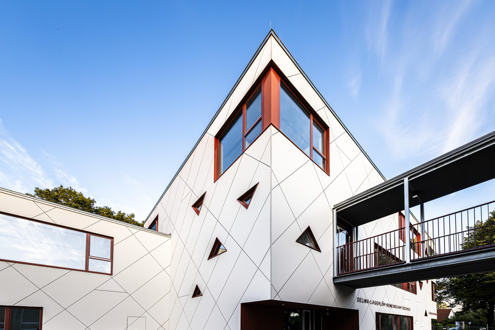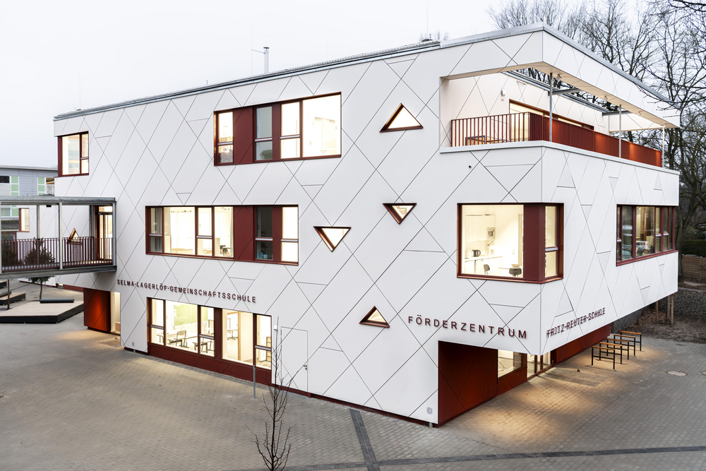 Zwei Schulen mit unterschiedlichem Bildungskonzept teilen sich an einem Standort ein neues Gebäude. Es besteht aus einem zwei- und dreigeschossigen versetzten Baukörper, der sich in die bestehende Bebauung einfügt und über eine offene Brücke verbunden ist. Rücksprünge und auskragende Geschosse definieren die Eingänge der beiden Schulen. Die Fassade des gesamten Gebäudes ist gitterartig und besteht aus hellen, matten Fassadentafeln. Ein Fugenmuster überzieht das Gebäude und erzeugt Schnittflächen. Unterschiedliche Glanzgrade der Materialien schaffen subtile Kontraste im Gegenlicht. In den Treppenhäusern wurden Dreiecksfenster integriert, die nach oben oder unten weisen.