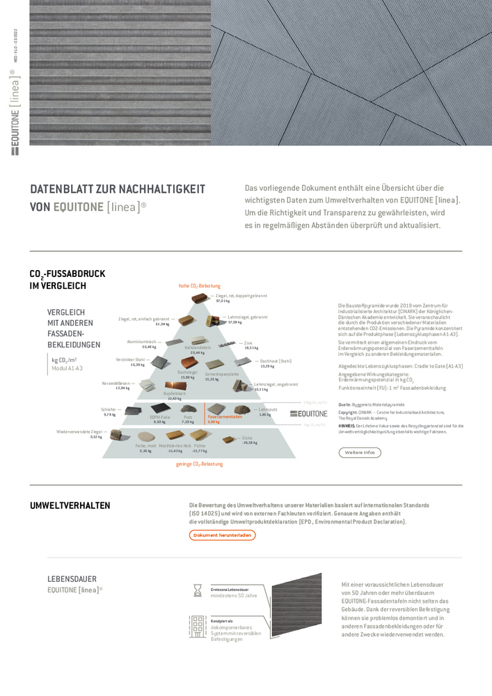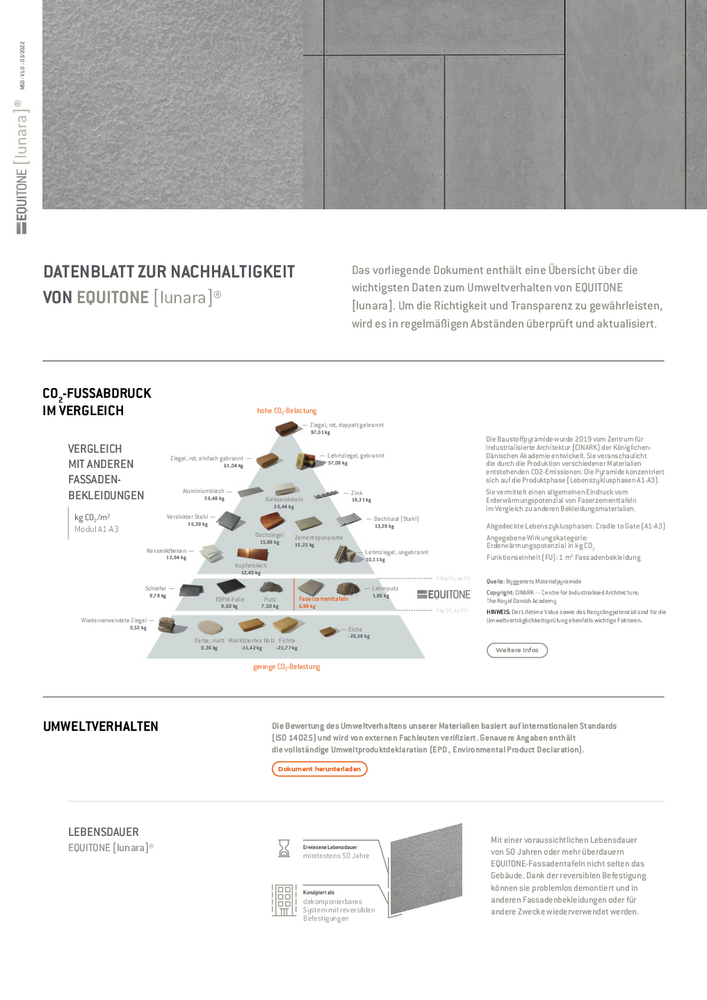 Echte Veränderung beginnt mit vollständiger Transparenz. Wenn Sie mehr über die Umweltauswirkungen unserer EQUITONE Fassadentafeln erfahren möchten, laden Sie die zugehörigen Datenblätter zur Nachhaltigkeit herunter.