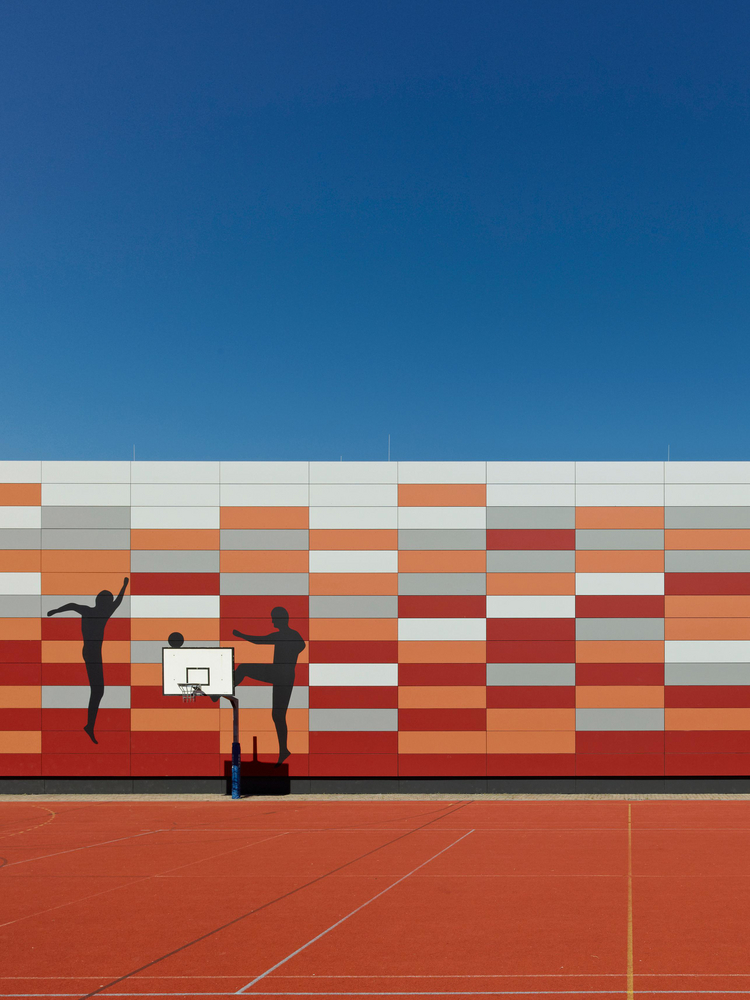 Die Sporthalle, eine Typensporthalle aus dem Jahr 1972 mit einer Waschbetonfassade, wurde umfassend energetisch saniert. Die alte Waschbetonfassade wurde gedämmt, lediglich im verglasten Stiefelgang bleibt sie farblich spürbar. Der Baukörper präsentiert sich nun mit einer neuen Hülle aus hinterlüfteten Faserzementplatten.