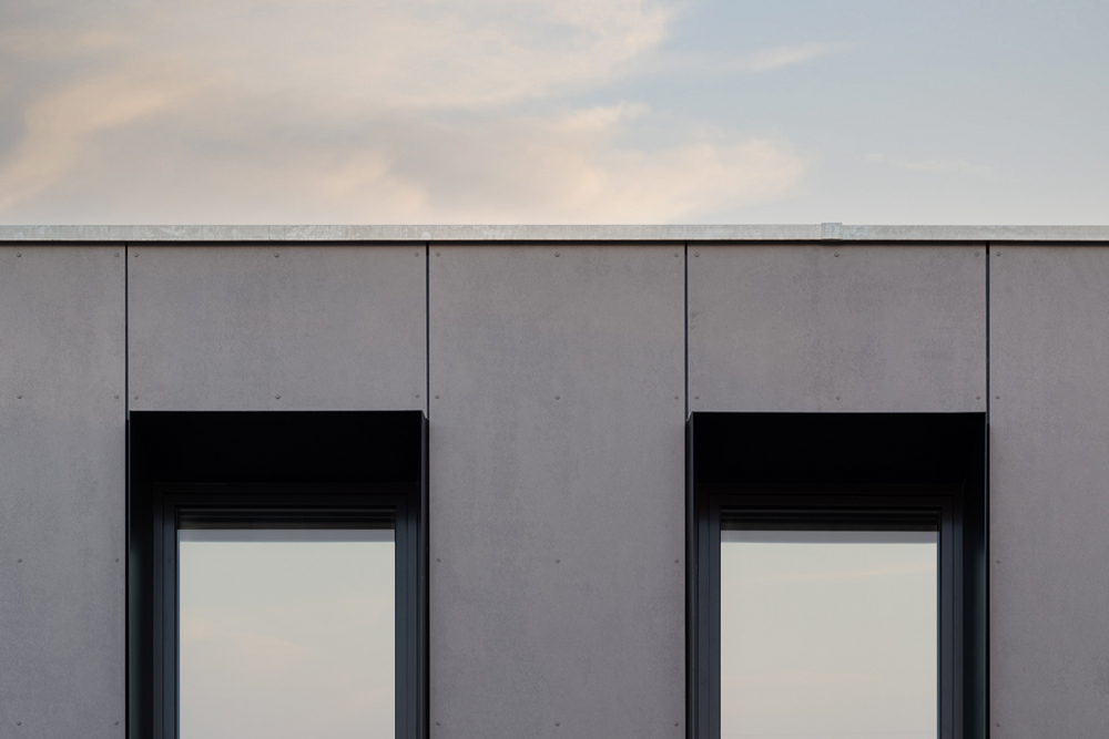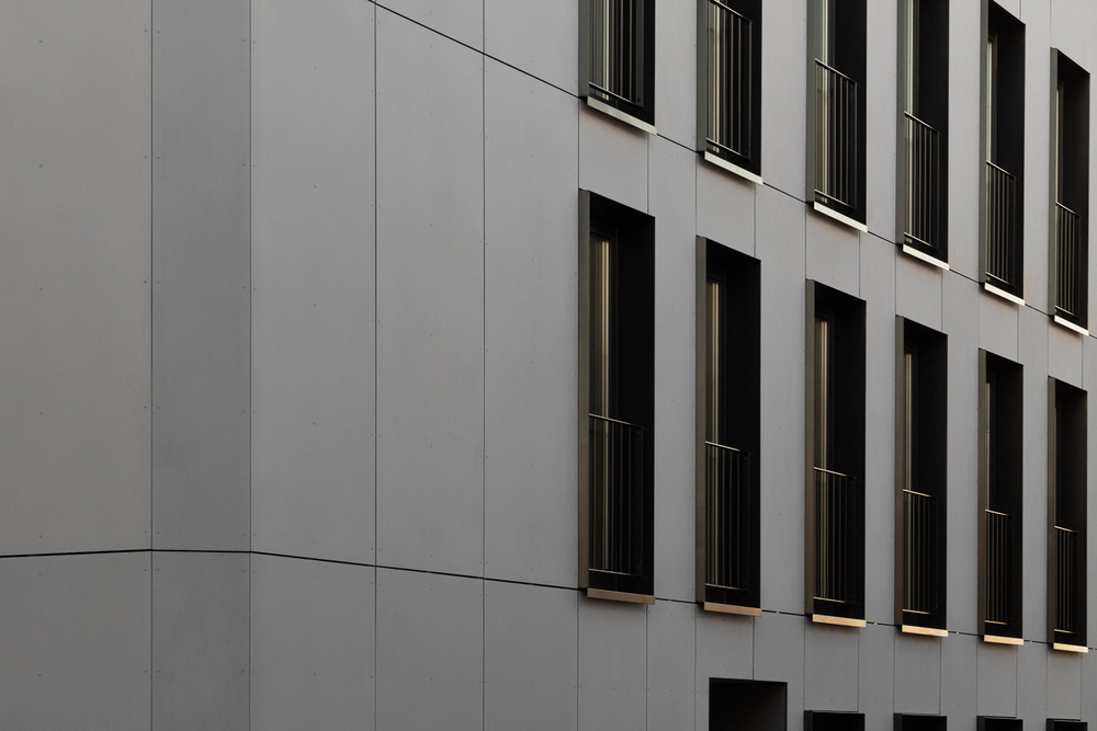 Faserzementtafeln prägen Symmetrie Von außen schaffen die Fassadenhaut aus langlebigen und nachhaltigen EQUITONE Faserzementtafeln sowie die individuell verteilten Fensteröffnungen eine markante Charakteristik. Der Gebäudeteil, der die Ecke des Häuserblocks besetzt, ist mit hellgrauen Faserzementtafeln EQUITONE [tectiva] TE 15 bekleidet und von Symmetrie geprägt. Hier finden sich raumhohe und dunkel umrahmte Fenster, die sich in ihrer regelmäßigen Reihung der umgebenden Bebauung subtil angleichen.