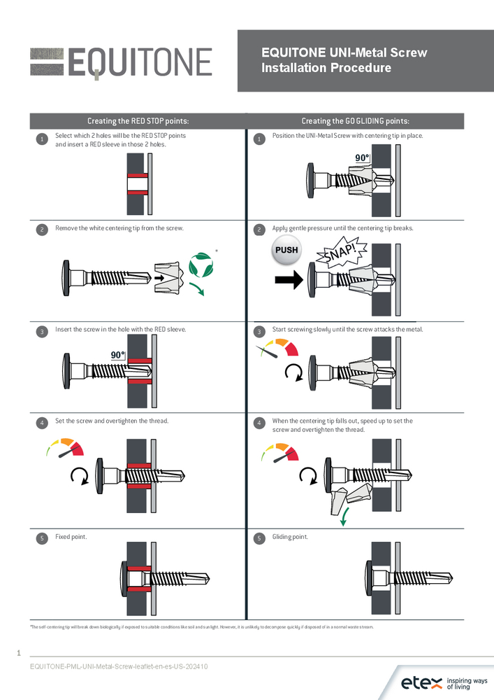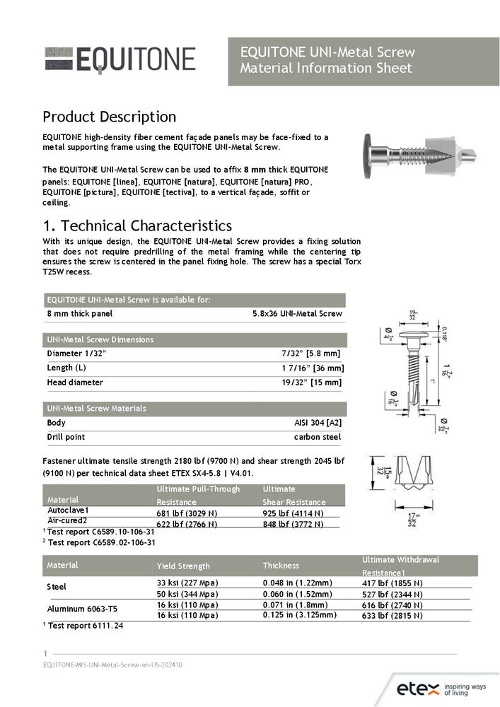 The EQUITONE UNI-Metal Screw is a purpose-built fastening solution for face-fixing 8mm EQUITONE high-density fiber cement panels to metal subframes—without the need for predilling the sub-structure. Its color-matched head ensures visual continuity, while the innovative biodegradable* centering tip delivers precise, low-strain installation. With high pull-out and shear resistance, this screw supports secure, long-lasting rainscreen cladding across vertical facades, soffits, and ceilings.