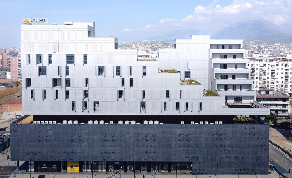 In the heart of Albania’s capital, Tirana, stands the Emerald Center & Residence — a key destination for international retail brands and contemporary luxury living. The building’s façades are clad in EQUITONE fibre cement panels in the [tectiva] texture, using shades TE15 and TE85. A distinctive feature of the design is the use of perforated panels, which introduce a sense of dynamism and modernity to the architectural composition.