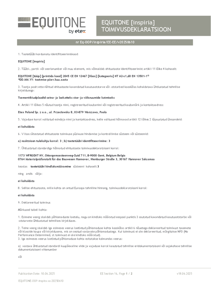EQUITONE [inspira] TOIMIVUSDEKLARATSIOON Toimivusdeklaratsioon EQUITONE [inspira] TOIMIVUSDEKLARATSIOON