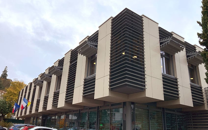 Construit sur trois niveaux, l’hôtel de ville se caractérise par sa ligne architecturale, épousant la pente du terrain, accentuée par l’effet flottant de l’étage, en surplomb de la partie inférieure.