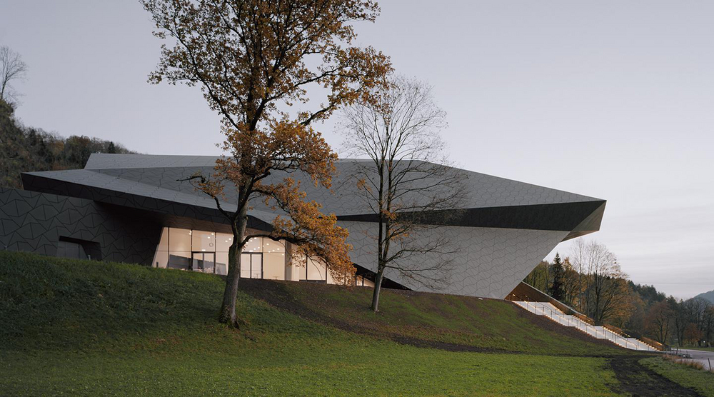 Šią juodą kampuotą koncertų salę suprojektavo „Delugan Meissl Associated Architects“ kaip kontrastą lenktam teatro pastatui, kurį ji papildo, Erle, Austrijoje.