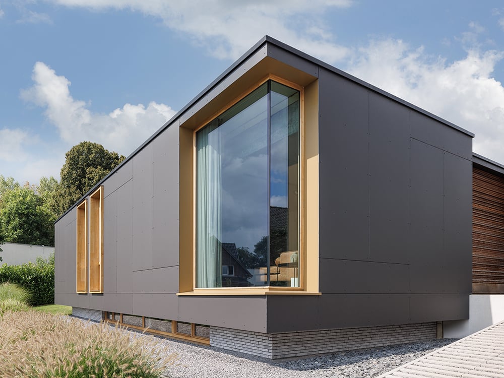 Voor de afwerking van deze gevel kozen we voor EQUITONE gevelpanelen. Deze zijn duurzaam, gemaakt uit 100% vezelcement, een inert materiaal dat geen insecten of ongedierte aantrekt.