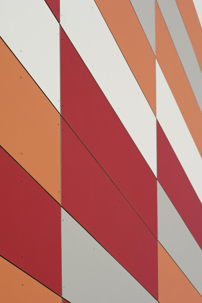 De polychromie van het gebouw ontvouwt zich vanuit de ruitvormige bekleding en stijgt speels en ritmisch op in een pixelachtige vorm, alsof het naar de wolken danst. Deze resulterende dynamiek wordt benadrukt door vijf meter hoge silhouetten van sporters in beweging, die het gebouw een onmiskenbare identiteit geven.