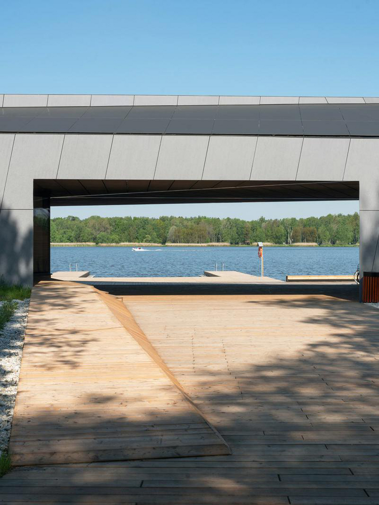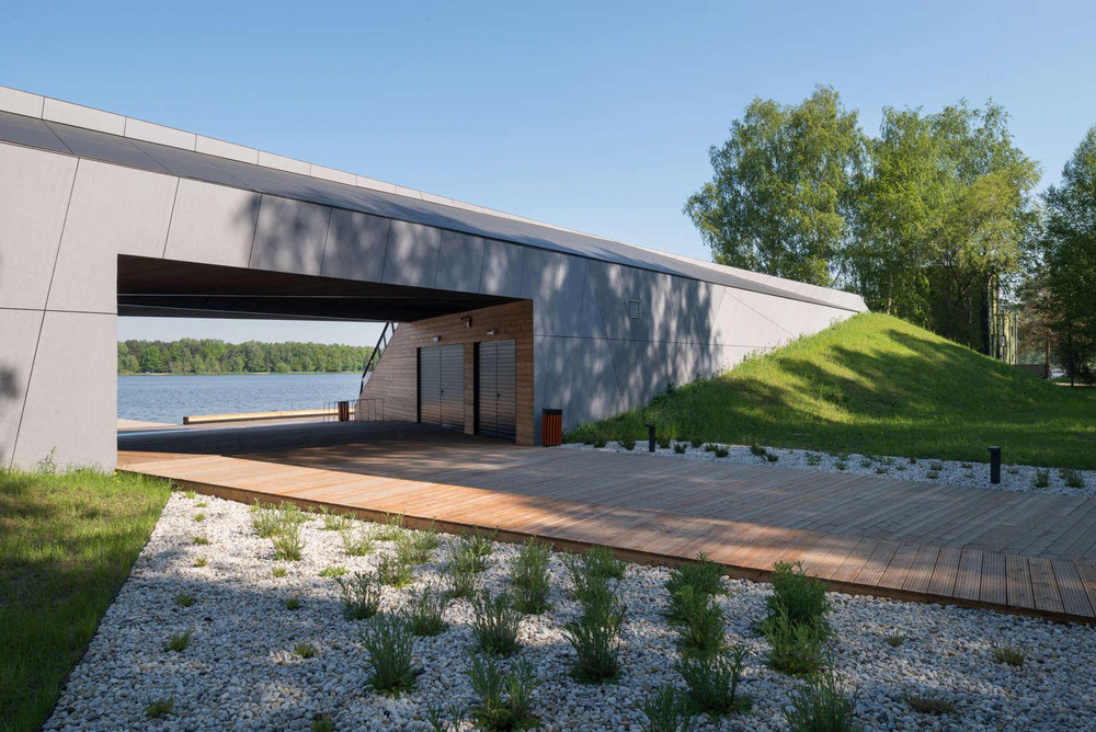 Budynek Przystani składa się z dwóch części – szkoleniowej oraz magazynowej. Rozdzielone są dachem, po którym można swobodnie spacerować i podziwiać przepiękny widok na jezioro. Już teraz można obserwować także na nim powoli rozwijające się nasadzenia, które wkrótce zazielenią go i stworzą w przyszłości wspaniałe miejsce do leżakowania. Od strony jeziora znajdują się drewniane schody, które podczas organizowanych zawodów będą służyć za trybuny. Tylna ściana wykonana została natomiast z szarych płyt włóknocementowych EQUITONE. Z pozostałych stron budynek otoczony jest zielonymi skarpami.